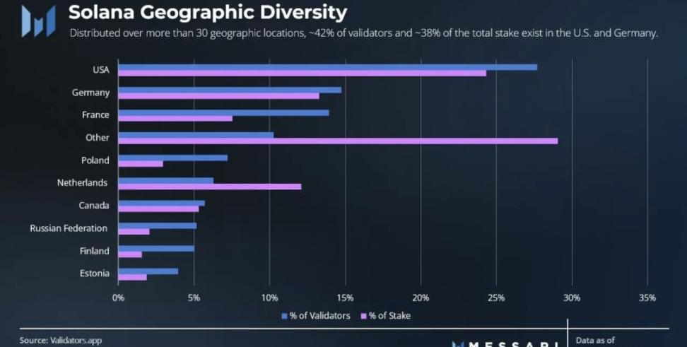 雖然分布在超過35個地理位置,但約42%的Solana驗證者和約38%的總質押位于美國和德國。「其他」地點占總質押的不到30%,但由超過25個不同的國家/地區組成。