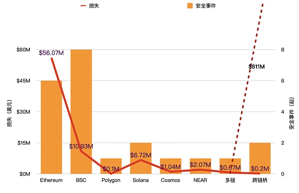 縱觀多條公鏈上的安全事件造成損失金額,其中以太坊上損失金額最多,達到 5,600 萬美元,其次是 BSC,損失金額達到 1,093 萬美元。