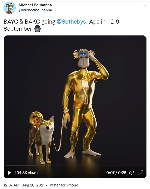 有消息指出,蘇富比副總監、當代藝術專家及數字藝術聯席主管Michael Bouhanna在8月28日發推稱, BAYC與BAKC將于9月2日至9日亮相蘇富比。