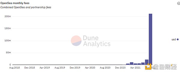 從上圖可知,Opense交易量從6月開始增長,6月交易量1.5億美元,7月增長1倍到3.26億美元,8月再躍升近10倍。的確是NFT summer。
