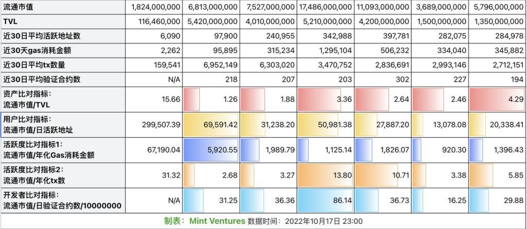 資產指標:TVL。用戶愿意將有價資產放在某條鏈上,表明了用戶對該條鏈的安全性、可用性、投資價值的綜合認可度,也是目前公鏈估值所最常用的數據指標。所以我們在此以defillama所統計的同質化資產的TVL作為近似的資產衡量指標,并且采用流通市值/TVL作為橫向比對的資產指標。該指標數值越小,說明其單位流通市值對應的鏈上資產數越多,估值也就越低。