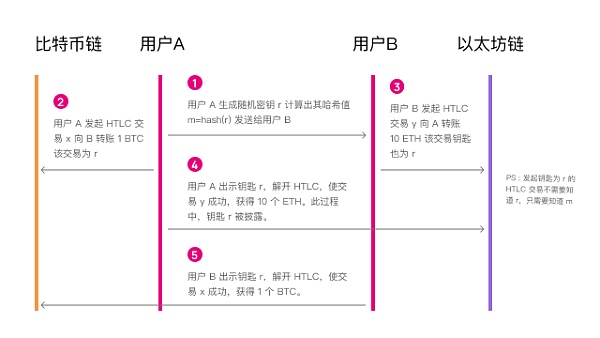 目前通過中心化交易所可以實現跨鏈通證交換,例如將BTC充值到交易所,換成ETH之后,再提現到ETH錢包。但人們不滿足于中心化的方案,希望能夠直接在鏈上進行可信交換,例如用戶A想要用BTC,交換用戶B持有的ETH,這個過程會有個問題,如果兩人約定了交易,但A進行了轉賬后,B食言而肥怎么辦?這就需要用到跨鏈技術,通過系統的撮合,讓兩筆轉賬能夠同步進行。基于哈希時間鎖的原子交換,是實現這一場景的典型技術。