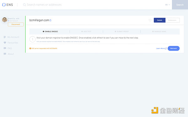 5.此時,在ENS管理器應用程序中返回你的域名頁面,檢查并查看你的新TXT記錄和DNSSEC設置是否已經通過。這個過程可能需要幾個小時,所以如果你沒有立即看到結果,不要擔心。