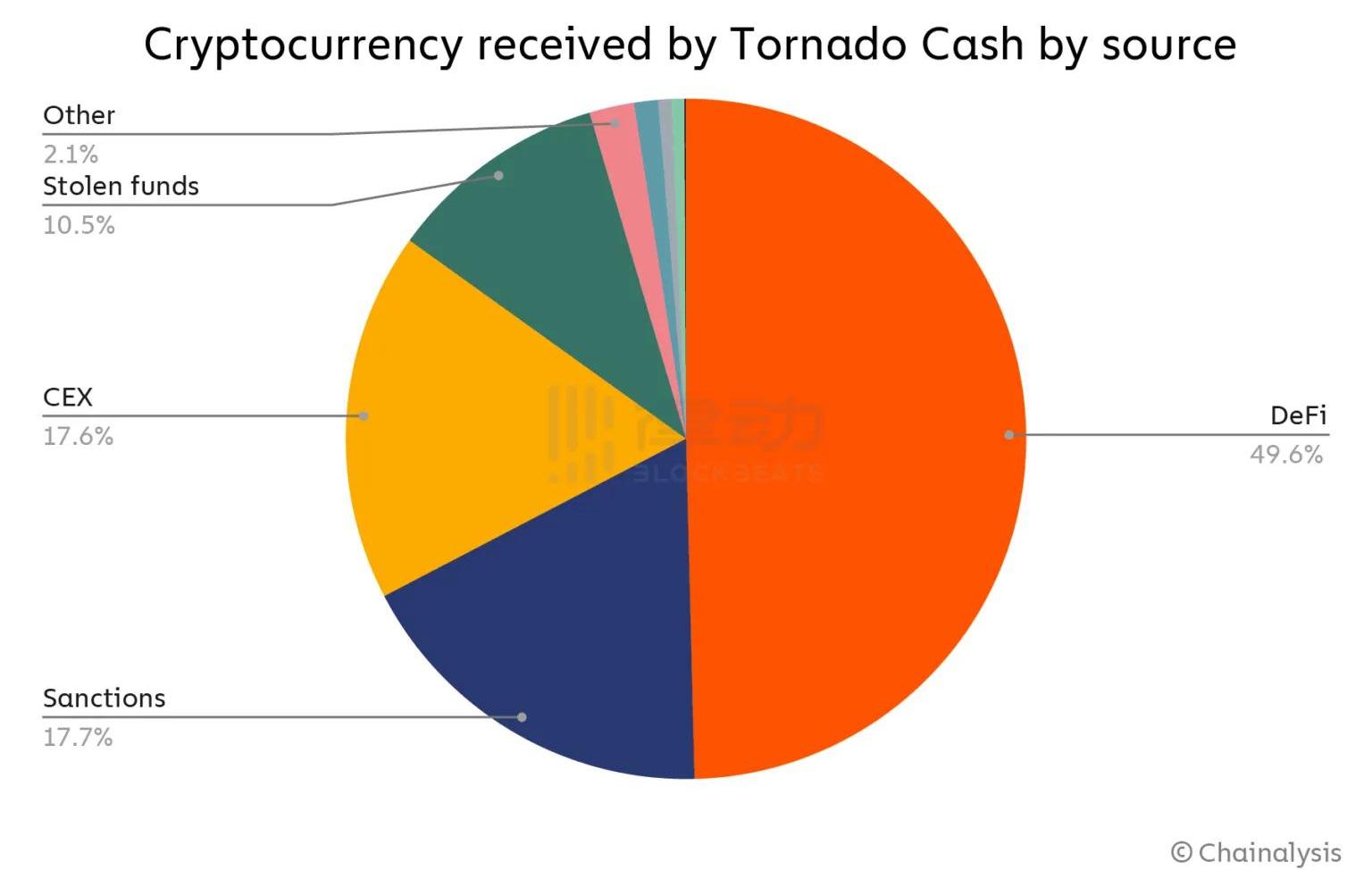 必須承認,混幣器的核心定位和功能,以及其很少要求KYC的特性,使它們自然而然地成為了網絡罪犯的首選。根據Chainalysis的數據顯示,從非法地址發送的資金中,有近10%是被轉到了TornadoCash這樣的混幣器中,而轉到中心化交易平臺、DeFi這些「主流基建」的資金甚至都沒有超過0.5%。