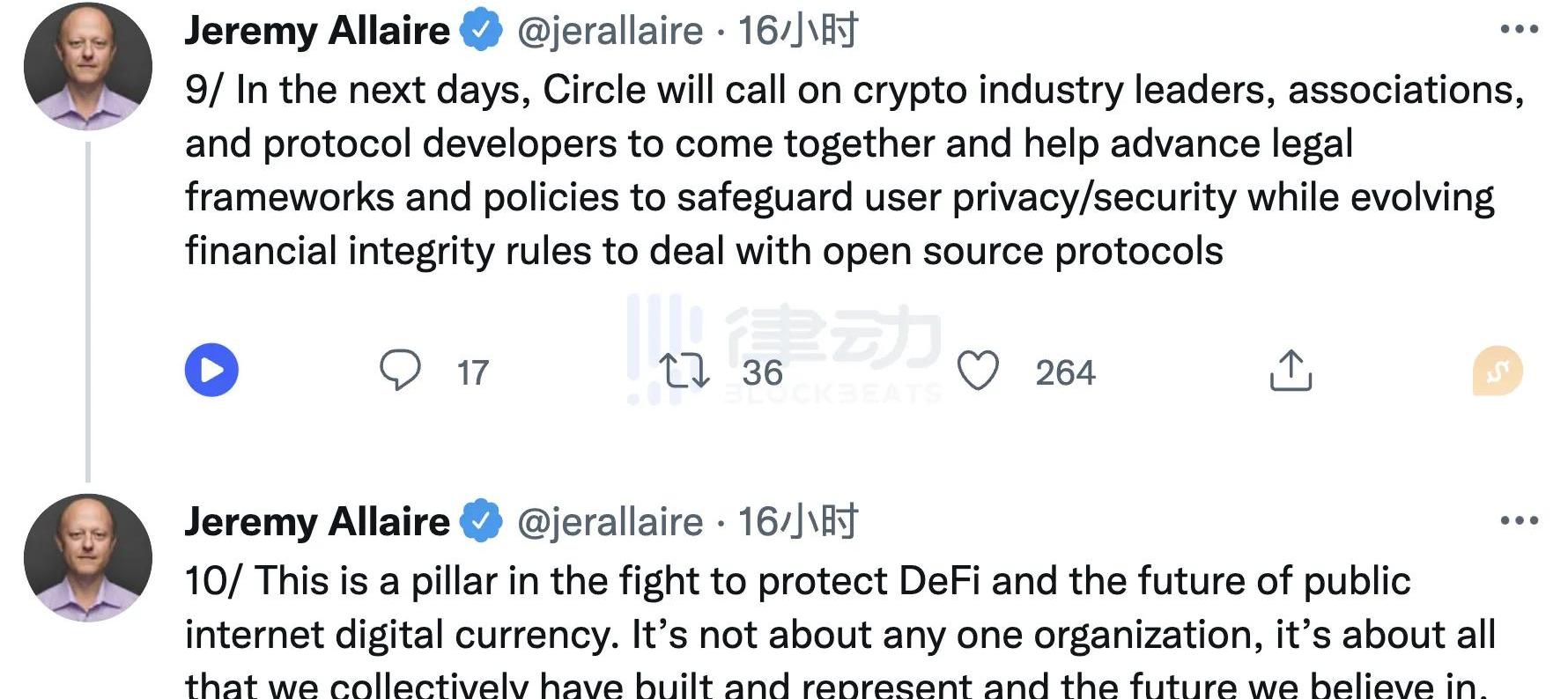 「整個加密行業進入了一個重大轉折點,政府對行業的監管也進入了未知領域」。在昨日早些發布的一篇博文中,CircleCEOJeremyAllaire不斷強調「TornadoCash事件」的重要意義。在表明絕對遵守監管秩序態度的同時,文章的字里行間都透露著Jeremy對此次行業監管,以及加密未來的顧慮與擔憂。