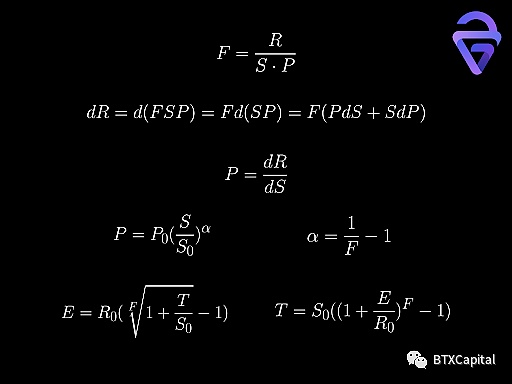 Bancor Network選擇的不變量是F,稱為連接權重。在第一個表達式中R是指流動性池中的儲備代幣數量,S是流動性池外的BNT總供應量,P是BNT和儲備代幣 的相對價格。我們可以代入P的方程,對兩邊積分2得到P和S之間的關系。這是一個指數表達式,其中指數α與連接權重F有關(F在0和1之間)。F越小,α越大,這意味著價格相對于BNT的總供應量變化得更快。