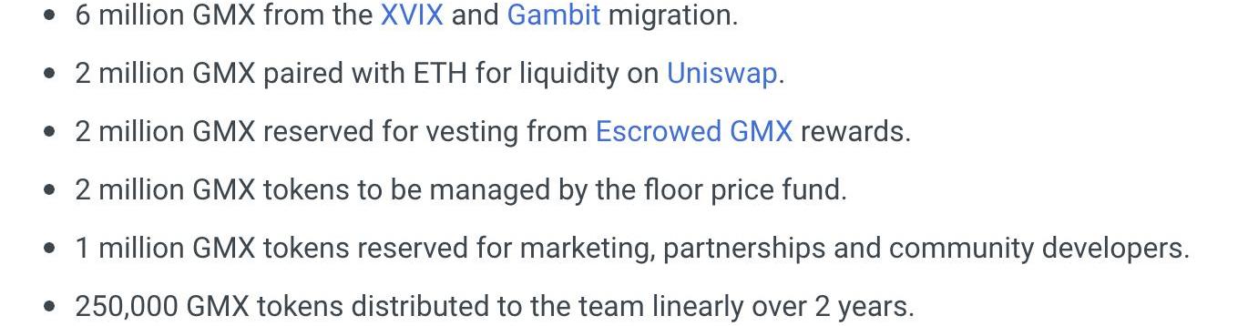 GMX已推出效用和治理代幣GMX,預計最大供應量為1325萬個GMX代幣。其中,從XVIX和Gambit遷移過來的有600萬枚,200萬枚用作GMX質押的?EscrowedGMX獎勵,200萬枚由底價基金管理,100萬枚用作營銷、合作關系以及社區開發者,分配給團隊的有25萬枚,這部分代幣分兩年線性釋放。