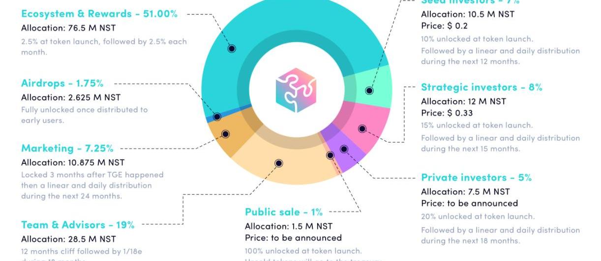 NST總量為1.5億,其中50%用于生態發展和激勵;7.25%用于營銷;7%用于種子輪融資;8%用于戰略輪融資;5%用于私募;1%用于公募;19%分配給團隊和顧問;1.75%用于空投。