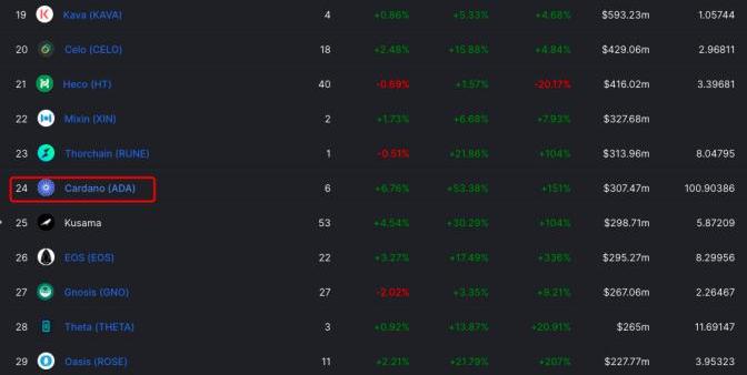 不過,需要注意的是,相比智能合約上線前,ADA的市值排名卻有所下滑。當前,ADA在加密資產市值排行榜中位列第7位,流通市值為326.65億美元。而在去年8月底,ADA市值一度高居市值榜單第3位,僅次于BTC和ETH。