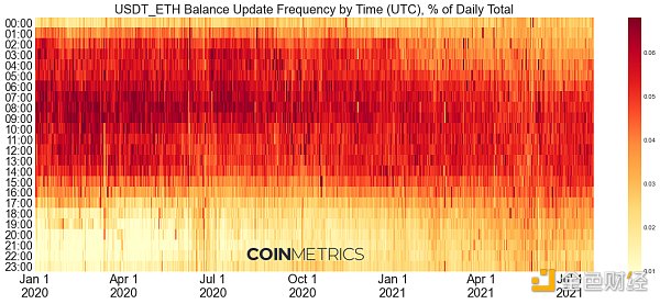 相比之下,USDC的活動往往遵循美國市場時間,盡管它的分布稍微更加分散。大多數日常活動往往在UTC14:00到22:00之間(美國股市在UTC 14:30開盤并在UTC21:00 收盤)。?