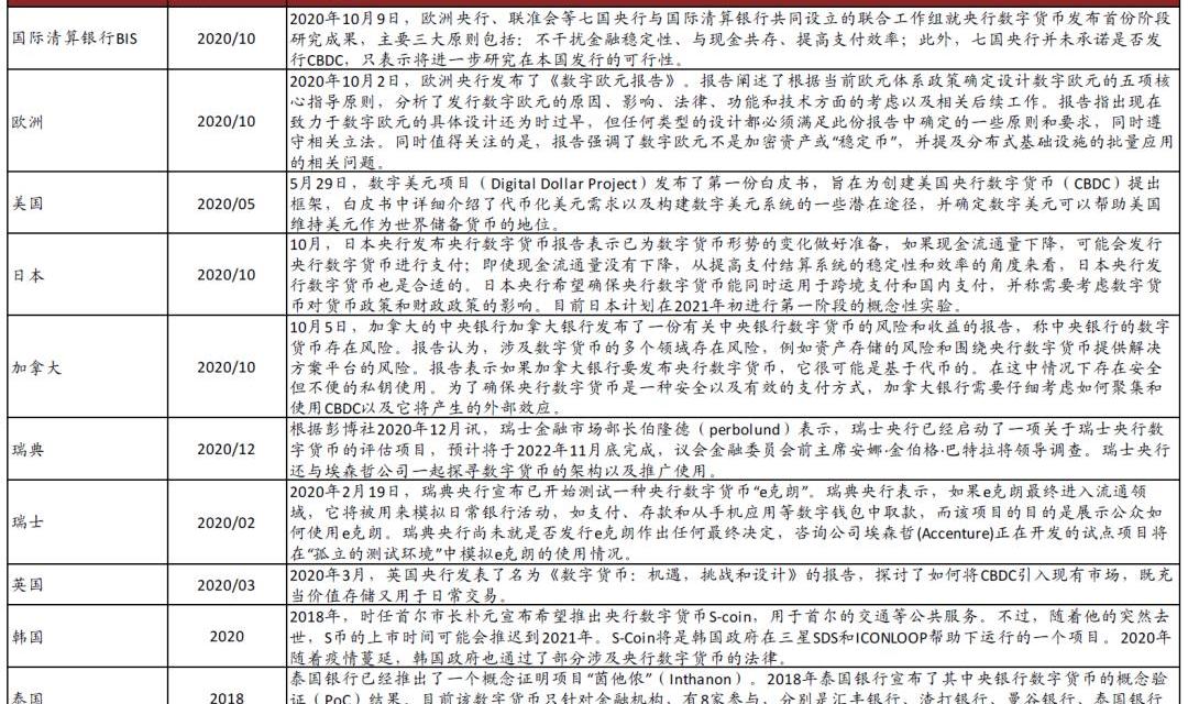 ?目前多國提出探索央行數字貨幣。根據國際清算銀行關于央行數字貨幣的第三次調查問卷報告,這一在2020年4季度發出的問卷調查覆蓋了全球65家央行,共涉及21個發達經濟體與44個發展中經濟體,占到全球72%的人口與全球91%的經濟產出,其中有86%的央行表示,他們至少在考慮發行CBDC的利弊,高于上一年的80%。