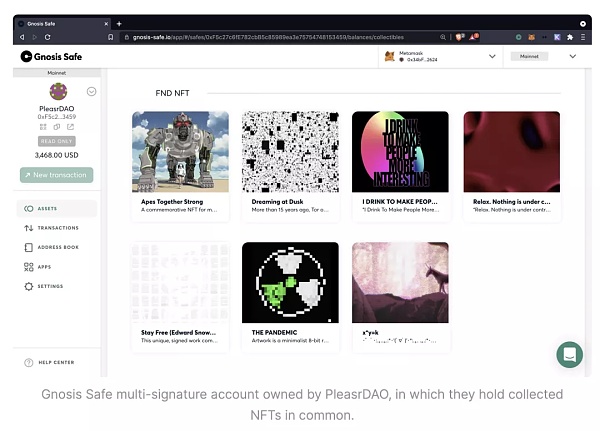 PleasrDAO 是一個集體競標藝術家 pppleasr 的 NFT。鑒于 NFT 數字藝術品拍賣價格不斷上漲,PleasrDAO 背后的想法很簡單:一群使用多重簽名賬戶的粉絲可以匯集資金進行競拍,并通過共同持有與其他主要競拍者競爭贏得拍賣。在贏得他們的第一次同名拍賣后,PleasrDAO 繼續收集其他作品,例如 Stay Free,愛德華·斯諾登 (Edward Snowden) 為獨立媒體慈善支持的 NFT,當時總計 22000 ETH 或等值 540 萬美元。他們一再成功的任務意味著,在仍然充當收藏家的同時,PleasrDAO 將擴大他們的范圍,開始由他們的社區孵化項目。像 PleasrDAO 這樣的倡議最有希望通過擴大會員資格來挑戰機構收藏家,邀請他們像 ppleasr 一樣收藏的藝術家依次成為集體的成員。