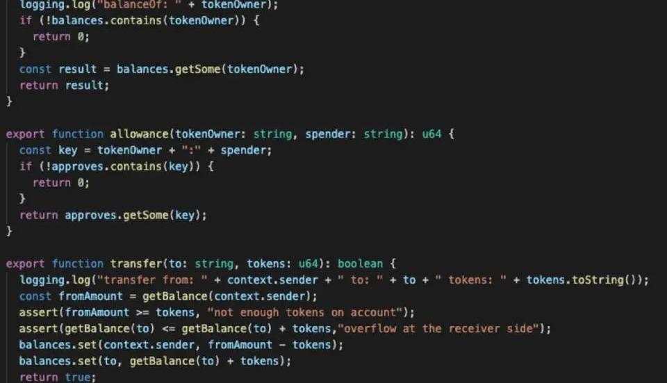NEAR合約類似ERC-20的一小段代碼,利用AssemblyScript編寫。Credit:NEAR
