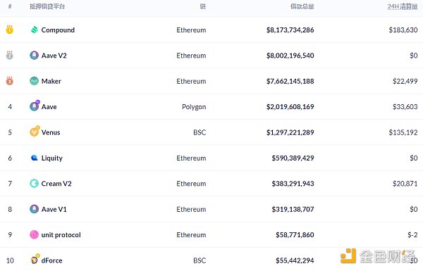 DeFi項目鎖定資產前十排名及鎖倉量,數據來源:Debank