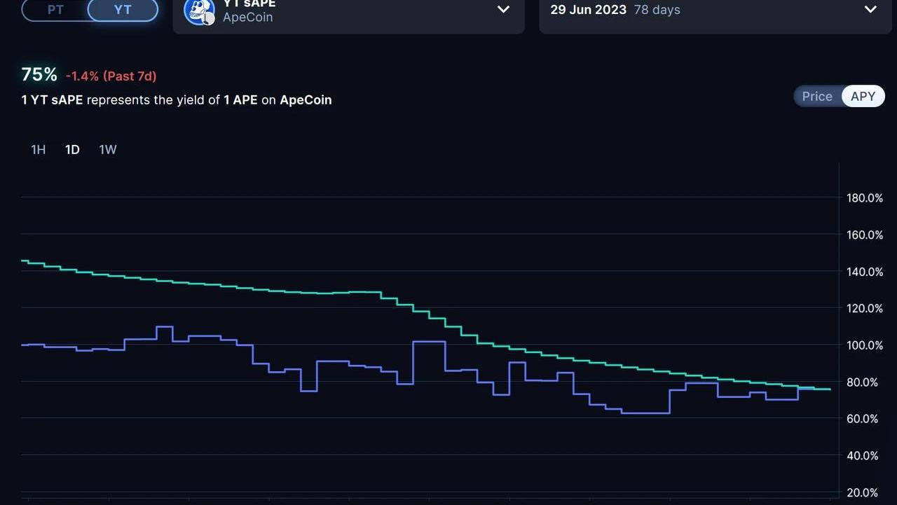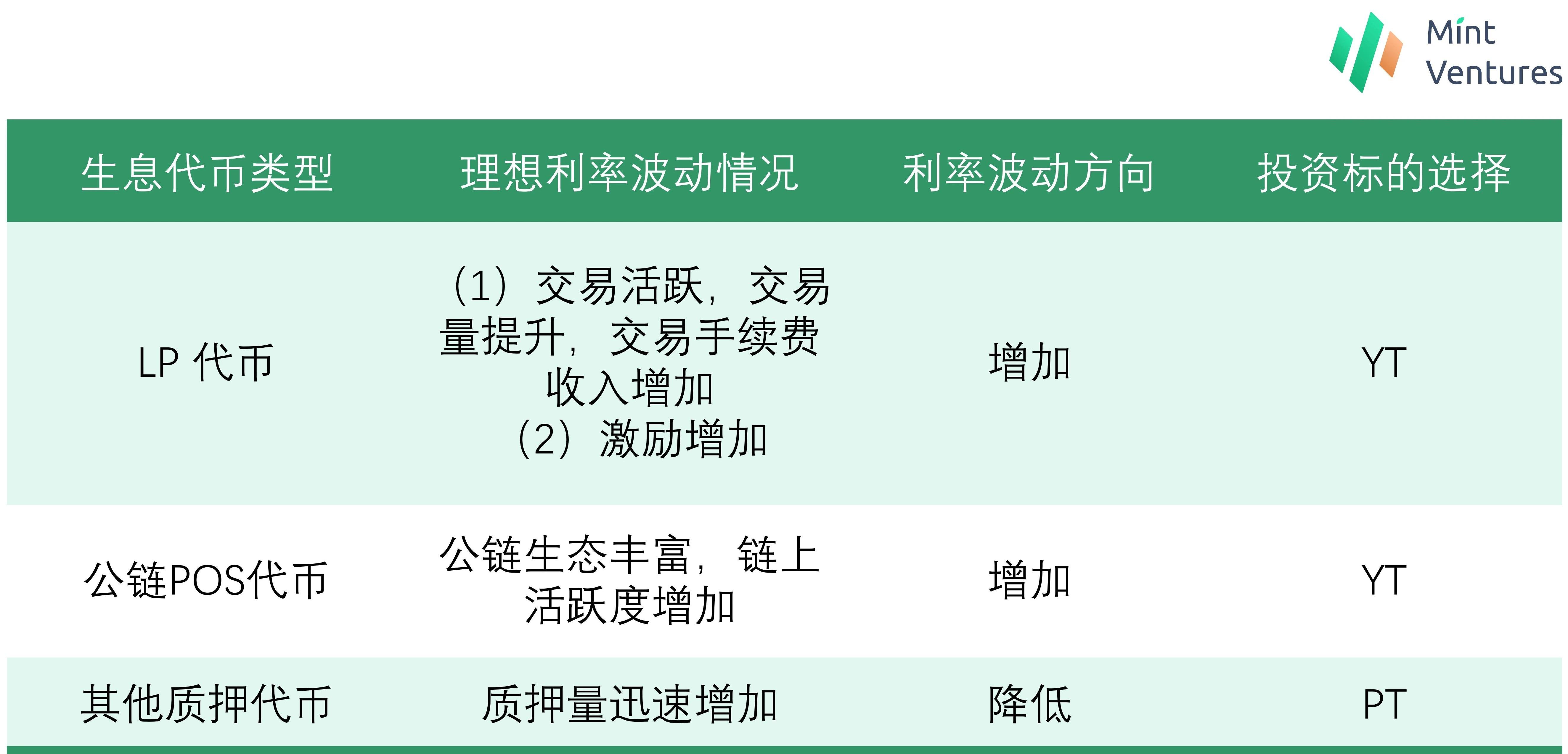 來源:https://dune.com/ponzidope/apecoin-staking-apy因為PT和收益率呈現出負相關關系,YT與收益率呈現出正相關關系,所以對于這一類代幣的投資策略是選擇觀測其質押代幣的數量和質押收益率的情況,如果出現質押收益率快速下降的局面,則PT會在短期內相對于SY出現明顯上漲。以U本位計算投資收益率的話,希望SY在上漲的同時,質押率提升、質押收益率下降,此時PT就將會是很好的投資標的。綜合來看,根據標的的不同屬性,我們可以得出不同的投資策略。