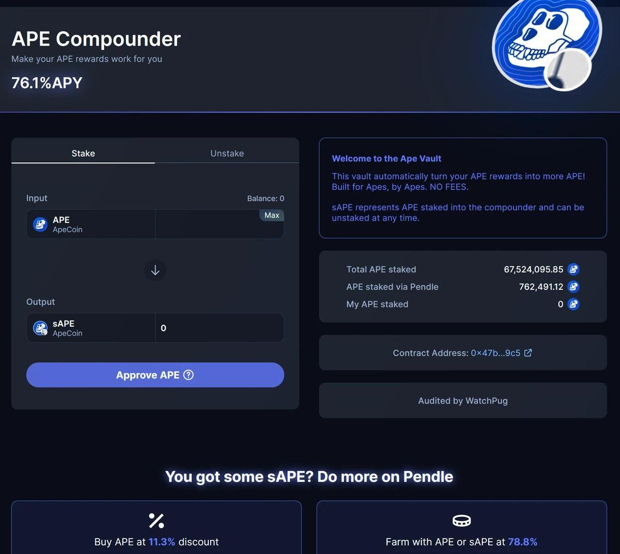 Pendle上線至今,一直專注于做收益代幣化。到目前為止出現了V1和V2兩個版本,通過兩個版本底層資產的變化,可以看到Pendle業務戰略思路的調整。在V1版本早期,Pendle選擇以借貸類DeFi的存款憑證為核心,底層資產是“穩定幣+公鏈代幣”。比如,在以太坊鏈上,底層資產選擇的是Aave和Compound的穩定幣借貸資產作為生息資產:aUSDC和cDAI;在Avalanche上,則選了TraderJoe的xJOE、BenQi的qiUSDC、qiAVAX等。這樣的標的選擇,符合當時“機構投資者進場”和“國庫資金管理”的敘事:2020年開啟的大牛市,讓很多傳統投資機構關注到了加密市場,伴隨著市場體量的擴大,一些項目的DAO國庫也充盈著大量的資金,能兼顧傳統投資者熟悉的品類以及如何更好讓DAO國庫資金賺取更多收益,成為一些投資者和創業團隊關注的重點。比如,在2021年10月MulticoinCapital就針對這樣的愿景開始討論利率管理工具。同時,與RariCapital、Olympus合作,拓展一部分代幣的應用場景。從V1版本的晚期到現在的V2版本,Pendle進行了調整,關閉了Avalanche上的業務,開始部署在了Arbitrum上。同時,標的不再局限在公鏈代幣和穩定幣,而是主要變成了4個方向。其中,以太坊涉及到3個方向:在以太坊鏈上,以流動性質押衍生品LSD作為主要底層資產,比如stETH、ankrETH等;拓展質押收益高且相對熱門的代幣,比如APE和LOOKS;對于相對熱門代幣,提供周邊服務,比如APECompounder,為這些代幣的持有者提供復投服務,并介紹相應的收益代幣池。