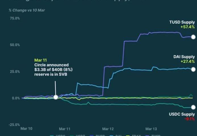由于USDC與美元脫鉤,恐慌蔓延到整個加密社區,USDC價格跌至0.8789美元的低點。截至當日收盤,USDC供應涉及19億美元的凈流出,一夜之間從3月10日的427.4億美元跌至3月11日的408.4億美元,降幅4.4%。美國監管機構于3月12日介入,為受SVB破產影響的儲戶和金融機構提供支持。盡管這一消息導致USDC重新掛鉤,但穩定幣的供應量和市值仍下降了9.1%。美元供應量凈流出為39.3億美元,從3月10日初的434.3億美元跌至3月13日底的395億美元。盡管如此,穩定幣TrueUSD和Dai在同一時期出現了顯著的供應增長,凈流入分別為57.4%和27.4%。Tether和Frax等其他穩定幣的供應也略有增長。從絕對值來看,DAI的收益最大,供應增加了13.5億美元,盡管在這個過程中也受到了影響。