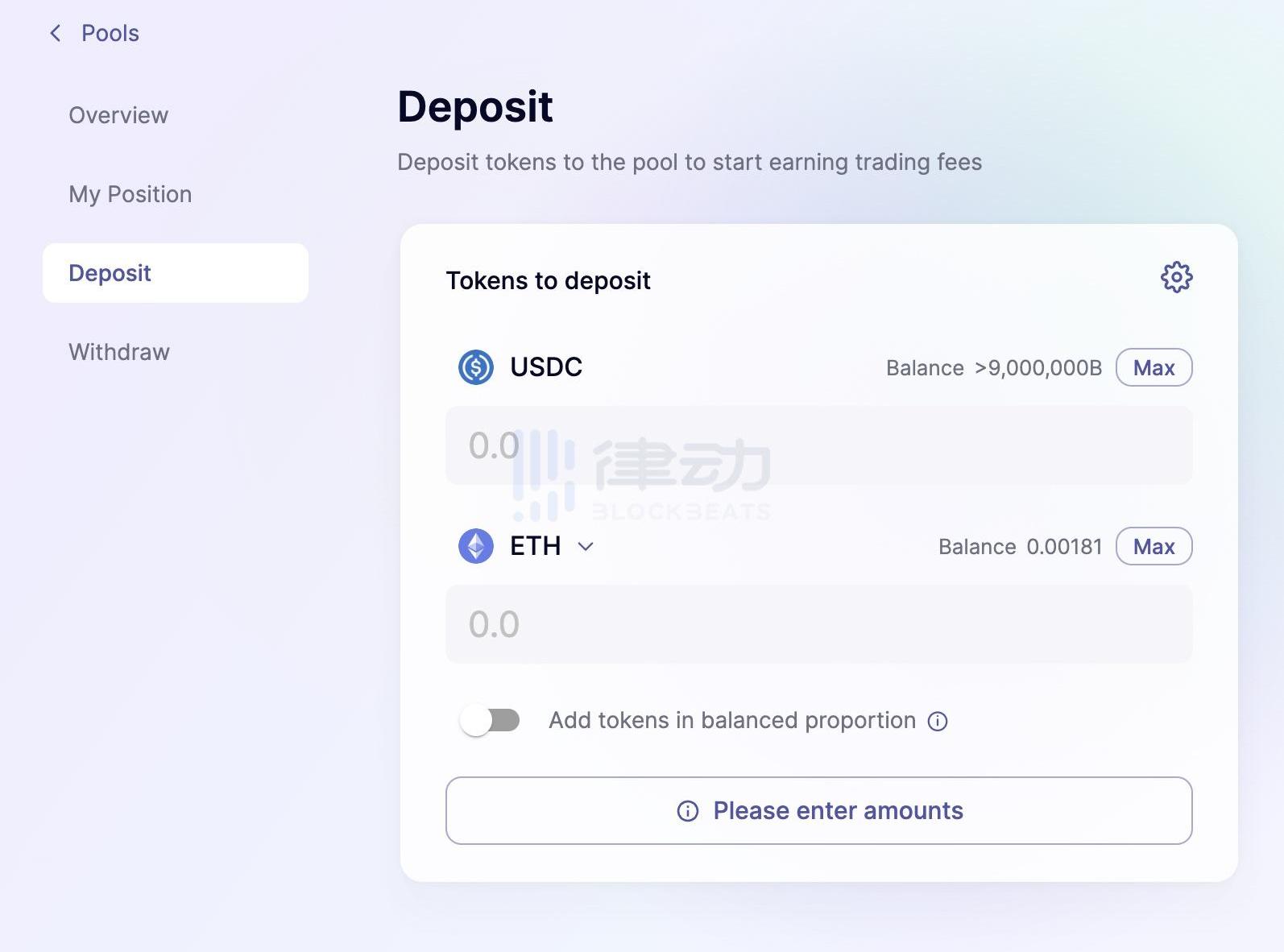 點擊Deposit存入ETH與USDC,添加流動性。BLockBeats注:首次使用該功能需要授權解鎖USDC然后才可以進行Deposit。