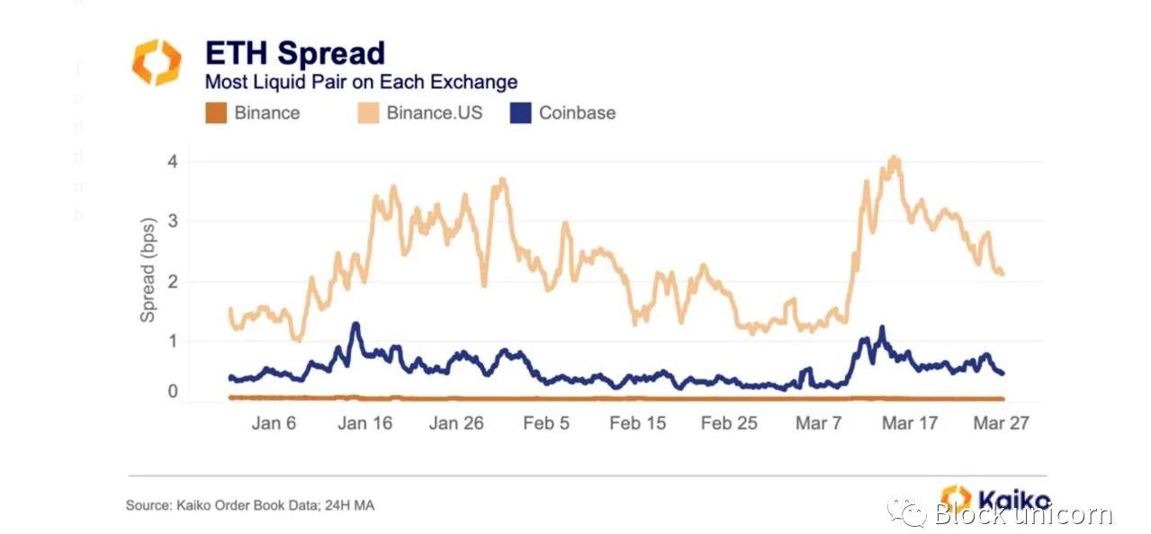 流動性在加密貨幣中是最重要的,特別是對于那些建立或出售大量頭寸或頻繁交易的機構。在這方面,Binance再次取得了很好的成績,截至本文寫作時,其利差比Binance.US收緊了36倍,比Coinbase收緊了8倍。不出所料,Binance的BTC-USDT和ETH-USDT的價差可以說是最小的。