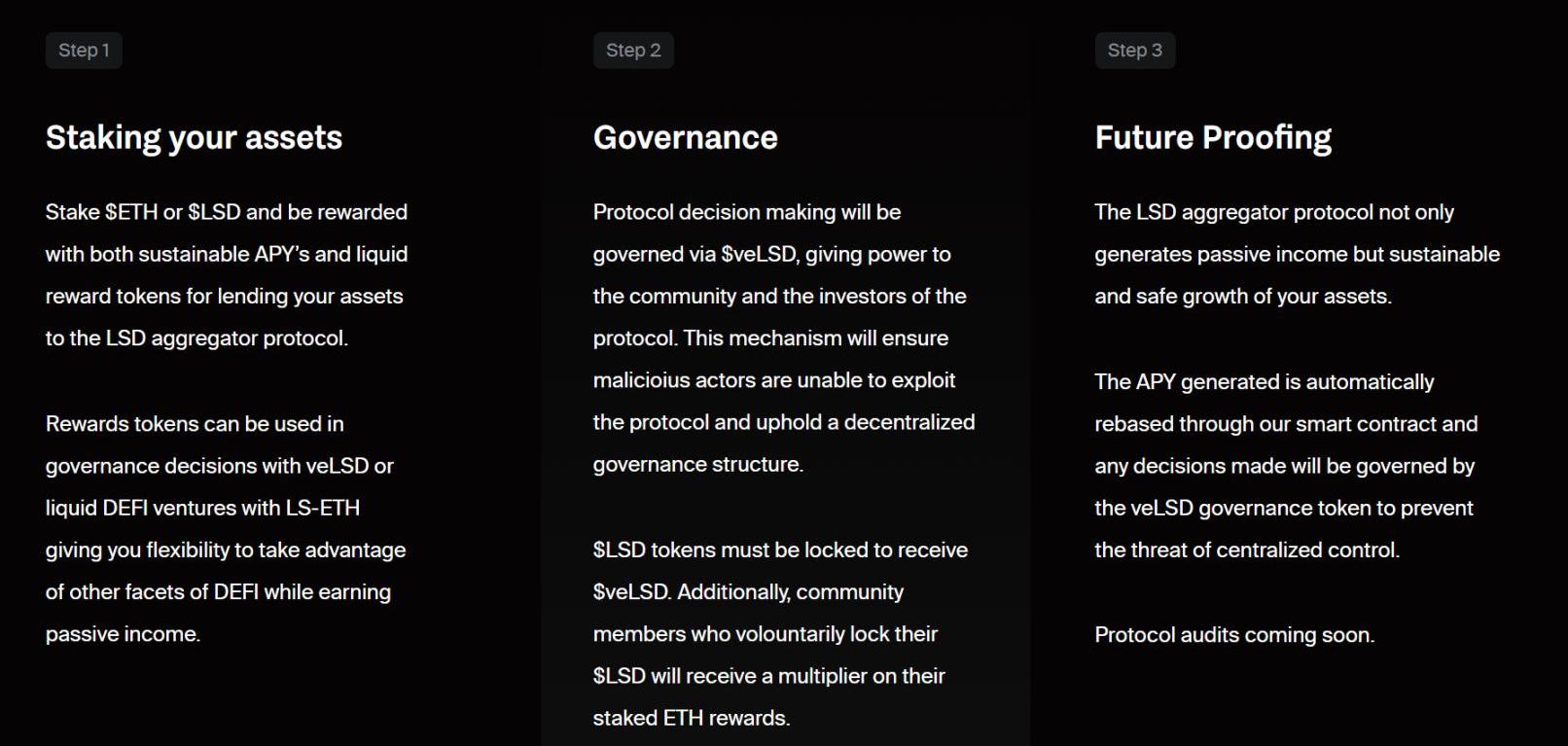 LiquidStakingDerivatives:一個通過對存入的資產進行代幣化和發行衍生代幣來解決流動性問題并最大化資產的杠桿作用的LSD聚合器。用戶質押ETH或LSD獲得代幣獎勵,獎勵代幣LSD可用于veLSD的治理決策或LS-ETH的流動性DEFI風險投資,自愿鎖定LSD的社區成員將獲得質押的ETH獎勵的乘數。