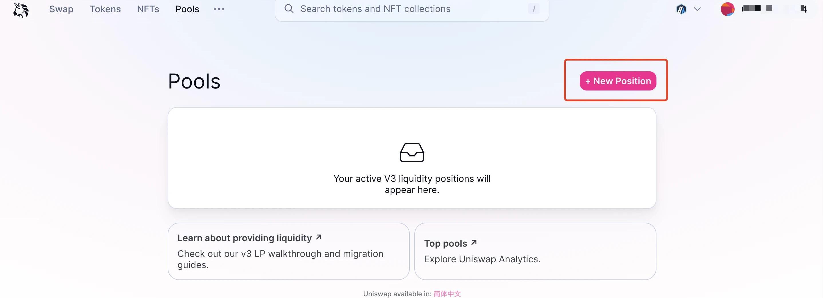 1、在Uniswap的頂欄中點擊Pools進入流動性池界面。2、點擊“NewPosition”添加新倉位。