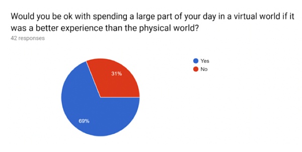 當中,69%的人們認為如果虛擬世界的體驗好于現實世界的話愿意在虛擬世界中花費相比于現實世界更多的時間。