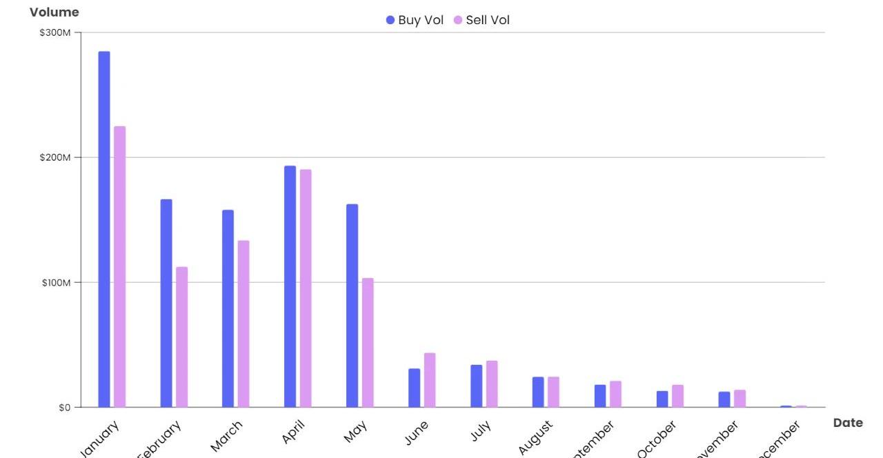 單一人均資產占比,數據來源:NFTGo.io9.NFT市場整體流動性最好的時期為1月份和4月份,進入5月則流動性開始大幅下降,9月份為今年流動性最為枯竭的時期,這讓多數NFT必須“打折”才能快速出售。