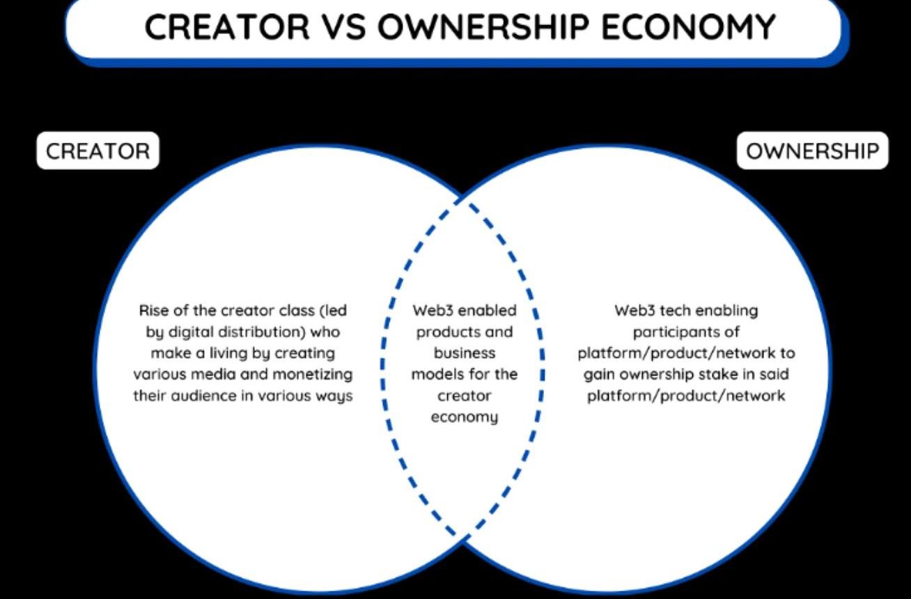 關于創作者及創作者經濟尚未有統一的定義,為了更方便的探討,我們首先通過一些關鍵定義來設定背景。創作者:制作具有教育和/或娛樂價值的媒體個人,其目的是增加觀眾。創作者經濟:創作者階層的崛起,他們通過創作內容和以各種方式將觀眾貨幣化來賺取收入。所有權經濟:所有權經濟是指下一代的產品/服務將由其參與者通過使用代幣化的激勵機制來擁有和運行。這滲透到所有的行業--娛樂、去中心化的金融、基礎設施、消費等。圖1:創造者和所有權經濟之間的關系