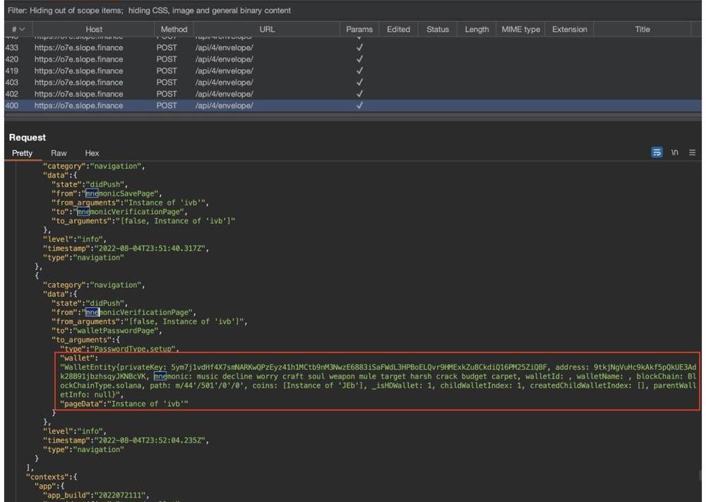 2022年最著名、影響最大的加密貨幣錢包安全事件源于Slope錢包對私鑰的不當處理。Slope錢包是一個非托管的數字貨幣錢包,適用于iOS和Android、Chrome瀏覽器的擴展。它支持多個區塊鏈,但主要活躍于Solana區塊鏈。2022年8月2日晚,價值約410萬美元的資產在大約四個小時的時間里被從9231名用戶的錢包地址中盜取。在事件發生的前幾個小時,當根本原因不明時,用戶就已出現了恐慌,Solana區塊鏈被黑的謠言也開始不脛而走。在攻擊發生的幾小時后,一名推特用戶發布了一張截圖,顯示了來自Slope移動錢包的HTTP流量。CertiK發現在導入錢包賬戶時,用戶的助記詞將被發送到Slope的Sentry日志服務器,任何有權訪問日志的人都可以接管該賬戶并從該地址轉移所有資產。