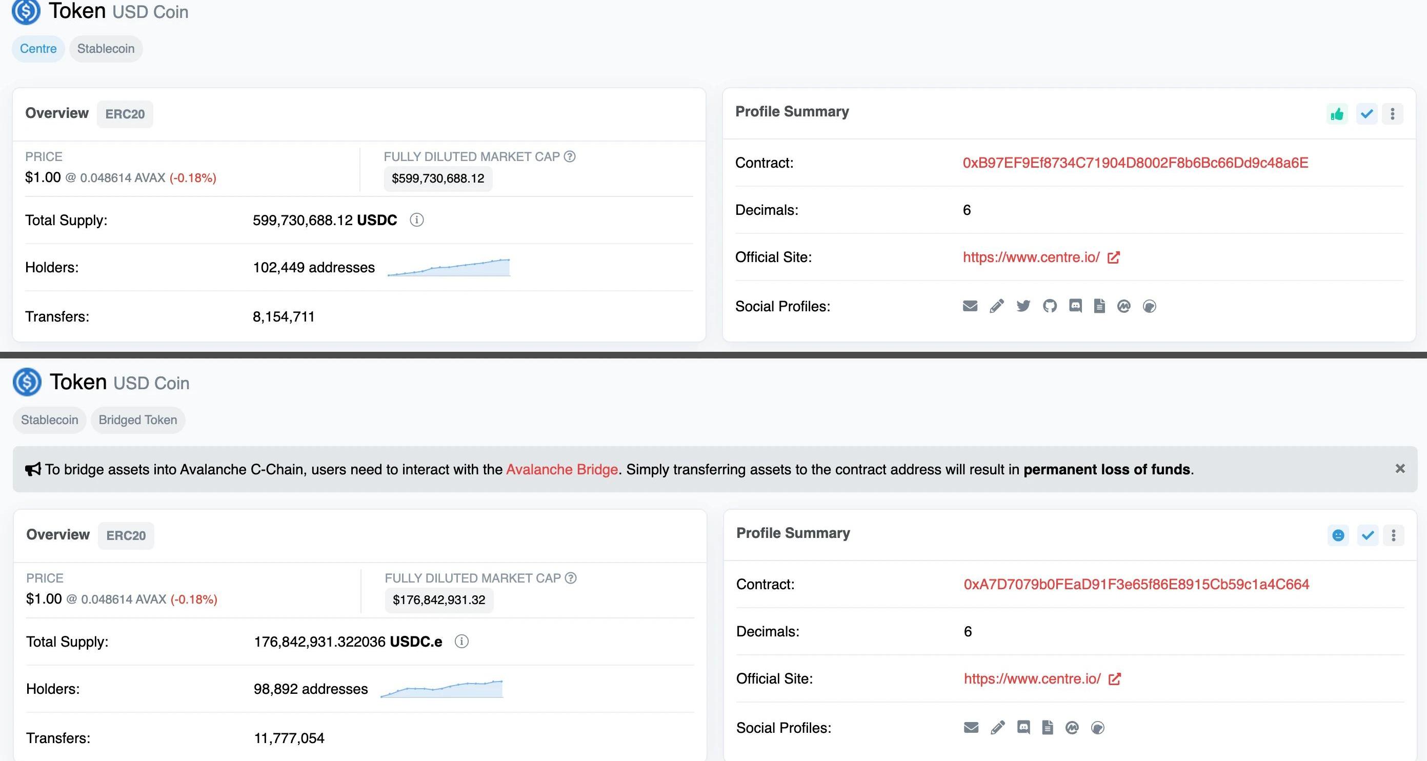 在傳統的“鎖倉-鑄造”模式的跨鏈中,弊端十分明顯。為了維持池子中兩個幣種1:1的價格錨定,需要LP提供者進行做市,而池中大量鎖定的代幣也成為絕佳的黑客攻擊目標。Odaily星球日報曾盤點史上規模最大的十次跨鏈橋攻擊。2022年3月,RoninNetwork的跨鏈橋遭到攻擊,損失總額高達6.24億美元。這也是史上最大規模的跨鏈橋被盜事件。Chainalysis研究發現,僅2022年,跨鏈橋攻擊事件就已造成超過20億美元的資金損失。此外,“鎖倉-鑄造”的模式天然將橋的兩端劃分為“原始鏈”和“目標鏈”,兩側代幣分別為原生資產和橋資產,大量被鑄造的代幣與原生資產并不相同。若橋出現安全問題,目標鏈被鑄造的資產將會面臨脫錨風險。在2022年11月的“pGALA事件”中,部署于以太坊主網的GALA代幣并未出現任何問題。而pNetwork跨鏈橋出現了安全問題,由其在BNBChain發行并鑄造的pGALA被巨量增發,1枚BNBChain的pGALA不再擁有對應的1枚以太坊GALA作為支撐,pGALA隨即歸零。對于資產發行方來說,在各鏈上流動性割裂的問題也影響著資產的使用。以Avalanche為例,目前在這一網絡存在兩種主流的USDC代幣。5.99億枚由Circle發行的原生USDC,合約尾號為“8a6E”。1.76億枚Avalanche官方橋發行并鑄造的USDC.e,合約尾號為“C664”。
