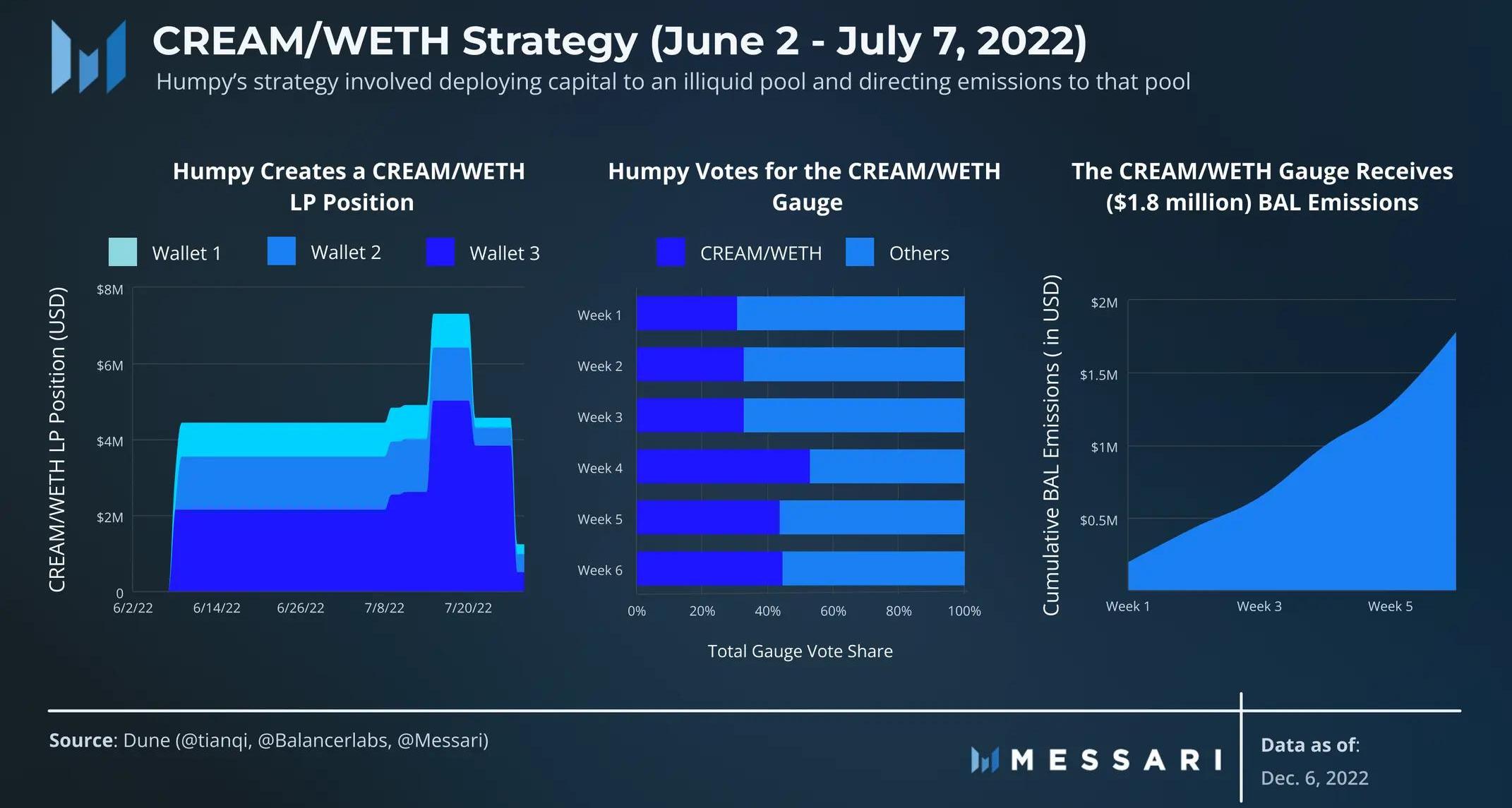 自Humpy第一次作為一個大型流動性提供者出現在Badger/WETH池中,BalancerDiscord一直在監控這頭特殊的veBAL鯨魚。直到2022年5月,該鯨魚在CREAM/WETH池中的行動才證實了它的意圖。了解了veBAL系統的動態,Humpy利用其veBAL執行了一個極其有利可圖的收益策略。該策略涉及積累CREAM的頭寸,創建一個CREAM/WETH池,通過CREAM/ETHgauge提案,并將池子的交易費用設置為10%。一旦創建,Humpy在多個地址部署他們的veBAL,以引導BAL釋放到池的gauge中。