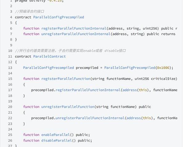 ?互斥參數:合約接口中,與合約存儲變量的“讀/寫”操作相關的參數。例如轉賬接口為transfer(X,Y),X和Y都是互斥參數。?互斥對象:一筆交易中,根據互斥參數提取出來的、具體的互斥內容。例如轉賬接口為transfer(X,Y),一筆調用此接口的交易中,具體的參數是transfer(A,B),則這筆操作的互斥對象是;另外一筆交易調用的參數是transfer(A,C),則這筆操作的互斥對象是。判斷同一時刻兩筆交易是否能并行執行,就是判斷兩筆交易的互斥對象是否有交集。相互之間交集為空的交易可并行執行。FISCO-BCOS提供了兩種編寫并行合約的方式,一種是solidity合約,另一種是預編譯合約。這里只介紹solidity合約,預編譯合約同理。solidity合約并行框架編寫并行的solidity合約時,在基礎上只需要將ParallelContract.sol作為需要并行的合約的基類,并調用registerParallelFunction()方法,注冊可以并行的接口即可。parallelContract代碼如下: