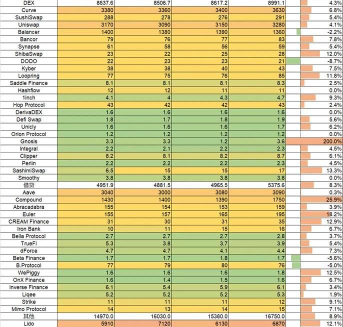 本周各鏈TVL均出現較大增長,其下多數協議也均迎來反彈,基本呈現大公鏈借貸協議增長超過DEX類協議,小公鏈DEX類增長大于借貸類,另Arbitrum本周出現滯漲,上周已完成對Polygon的反超,所有鏈中TVL第四名,本周重新回落。1)ETH鎖倉量情況