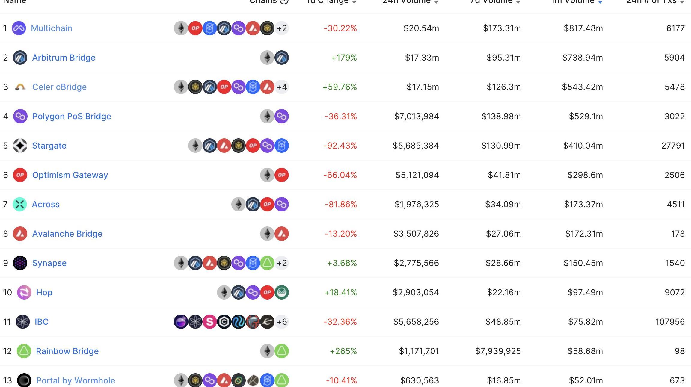 在借貸的一些細分領域,將抵押品進行分級的Euler和優化存借利息的Morpho占有了一定的市場,TVL分別為1.84億美元和1.28億美元;Maple等無抵押借貸隨著FTX的暴雷而出現大量壞賬;將每一個借貸市場分離開的Silo也只有2194萬美元的TVL。跨鏈橋:Multichain流動性和交易量均位列第一,Wormhole的TVL最高下降94.6%