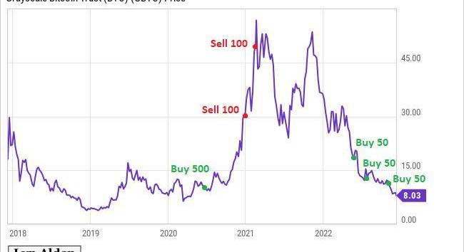 許多交易公司在這一工具上有杠桿敞口,因此這對他們來說是一個比人們可能意識到的更大的問題。多年來,GBTC是為數不多的以證券形式獲得比特幣敞口的方式之一,這是許多受監管實體所希望的。因此,它的交易價格高于資產凈值「NAV」,因為它提供了一些在這種類型的證券化組合中很難獲得的東西,包括在經紀賬戶中。隨著越來越多的基金和證券進入市場,為這些受監管的實體提供比特幣價格敞口,GBTC變得不那么獨特,其溢價也消失了。大多數封閉式基金的交易價格相對于資產凈值略有折扣,而GBTC也不例外。我的比特幣敞口絕大部分直接投資于比特幣本身。然而,在我的經紀投資組合中,由于缺乏更好的替代品,我使用了少量的GBTC頭寸來復制比特幣價格敞口。我不時地重新平衡它的風險敞口,特別是當它的溢價變得過高時,就像我的NoLimits投資組合: