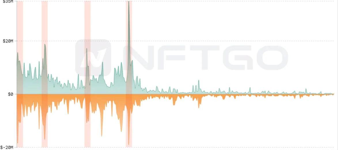 6-12月巨鯨資金規模趨勢線(Source:NFTGo.io)除了資金規模,5月份以后NFT市場也開始了巨鯨賣出規模持續高于買入規模的情況,凈流入資金多次轉為負值,雖然5月份已有部分巨鯨開始拋售,但真正資金出逃是在6月,總計出現了125.4萬美元的資金凈流出,而6月也成為了大部分巨鯨的出逃NFT市場的時間,下圖為巨鯨在6月之后的資金流向統計,我們可以看出流出NFT市場的資金規模已經遠遠大流入的規模。