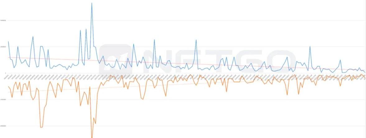 在5-6月份,受到總體市場的影響,巨鯨大大縮減了在NFT市場上的資金流動規模,買入資金和賣出資金開始從6月的3000萬美元穩步下跌至12月的1000萬美元,趨勢線呈線性下降的形狀。