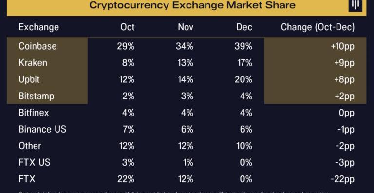 受監管的交易所已經存在了很長時間,它們是透明的、經過審計和受到監管的。答案已經在這里了。有各種各樣的加密批評者和持懷疑態度的監管機構都在談論區塊鏈交易需要一些完全不同的未來,但它已經存在了,而且已經存在了很長時間。像Coinbase、Kraken和Bitstamp這樣的交易所,當客戶向他們匯款時,他們只是把錢存入銀行。現在有很多人談論高科技“儲量證明”,但這只是故事的一部分。這僅僅顯示了資產負債表上部分資產的證明,但沒有負債。答案很簡單:你聘請四大會計師事務所,你證明你不僅擁有資產,而且證明你沒有超過資產的負債。這不是什么新鮮事。九年前,Pantera聘請安永(Ernst&Young)對加密實體進行首次審計。作為對區塊鏈的理解有多深的一個標志——為了完成審計,我不得不在辦公室與永安一起度過新年前夜。我必須證明我們持有多少比特幣。如果我能在新年前的一個工作日中午轉移它們——他們團隊中的任何人都可以通過公共的區塊鏈瀏覽器確認這些比特幣在新年周末后仍在同一個賬戶中。我曾擔任Bitstamp董事長多年。四年前,安永再次受聘對Bitstamp進行審計。德勤審計了Coinbase。如果你將加密貨幣存儲在交易所,請與審計員一樣保持謹慎。受監管、透明和經過審計的交易所的市場份額正在急劇增加。這實質上是在挽回那些逃往不安全的海外交易所以尋求更多交易、更多杠桿和更低費用的客戶。自10月以來,Coinbase、Kraken、Upbit、Bitstamp等交易所的市場份額增加了30個百分點。