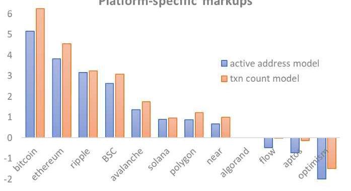 你心目中的案例真的能成為一個例外嗎?它在統計學上有可能嗎?第三,盡管這些估值差距往往意味著回歸,高估或低估期一般持續6個月到一年,但沒有辦法準確預測它們會持續多久。僅僅因為一條鏈今天看起來被低估了,并不意味著它明天就會自我修正,反之亦然。典型的「價值投資者」陷阱是買入一些看起來被低估的東西,而這些東西會一直被低估下去。當你相信某個東西被低估時,更好的方法是把它放在你的雷達上。但只有當你看到一些跡象表明趨勢可能會轉向時才買入。最后,這里有對平臺特定加價的估計。同樣,這些衡量著一個平臺的護城河或感知風險水平。如果一條鏈被認為有更大的護城河,即更有可能繼續生存和發展,那么它可以在相同的采用和使用水平上獲得更高的價格。在這些加價中,有一些突出的模式。你很聰明。我相信你能發現它們是什么。