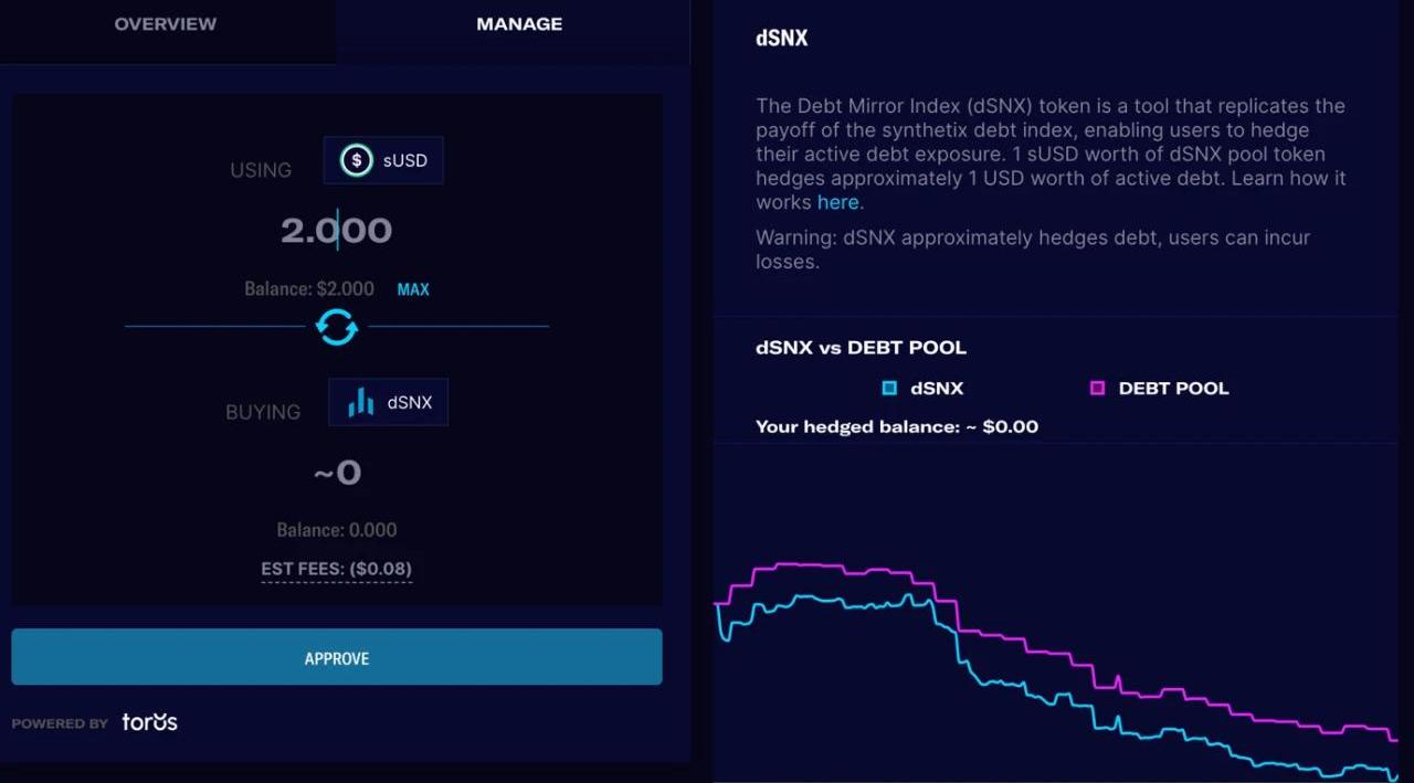 由上圖可見,當前sUSD和sETH的對沖債務比例為7/3開,因此質押人需要保持頭寸有70%的sUSD和30%sETH來規避掉池子債務比率上升時的風險。但是缺點在于對沖債務比率會隨時波動,在一方面會限制用戶交易策略,在另一方面用戶也會由于不能及時調整比例而面臨一定的風險敞口。因此Synthetix設計了一種動態追蹤指數dSNX可以實時根據債務池比例的變化而波動,以此來達到對沖的效果。