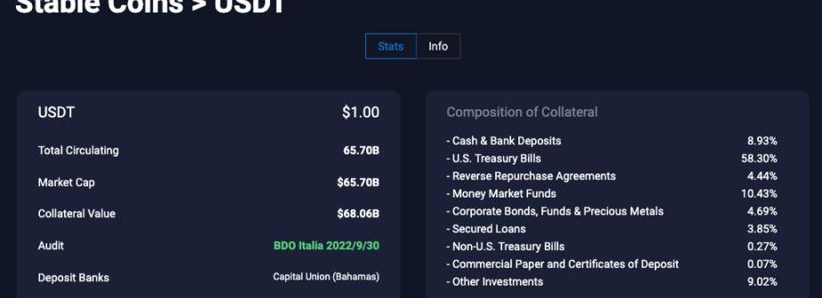 USDT公鏈分布,來源:https://chaineye.tools/stablecoins/stats/USDT錨定機制發行方進行足額資金儲備,讓用戶可以隨時使用USDT與USD進行1:1兌換。潛在風險分析①原生發行方抵押物不足風險Tether儲備的支撐USDT的資產并非完全透明,有被公司挪用的風險以及相應的投資風險。USDT持有者可以通過Chaineye查看Tether的資產負債情況以及儲備金的分布,判斷其潛在風險。目前Tether為USDT的儲備資產價值約680.6億美金,超過發行量657億美金,其儲備資產中約90%為流動性較好的現金和現金等價物,以及9.02%的份額用于包括了加密貨幣的投資,存在一定風險因素。Tether從2017年開始不定期發布審計報告,最新的審計報告于2022年9月30日發布,審計公司為BDO,是全球第5大會計所,總部位于布魯塞爾,Tether使用的是意大利的BDO。Tether此前的審計來自于開曼群島的一家審計公司,叫做MHACayman,之前叫做MooreCayman,其母公司是英國的頭部注冊會計公司MHAMacIntyreHudson,曾在2022年1月因審計問題被英國金融監管局調查。