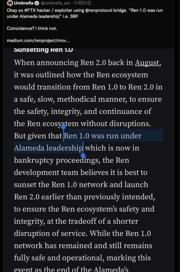 另一位用戶還提到了RenProtocol及其RENToken以及renBTC。REN是原生BTC跨鏈橋,最近受FTX崩盤事件影響,也是風波不斷。