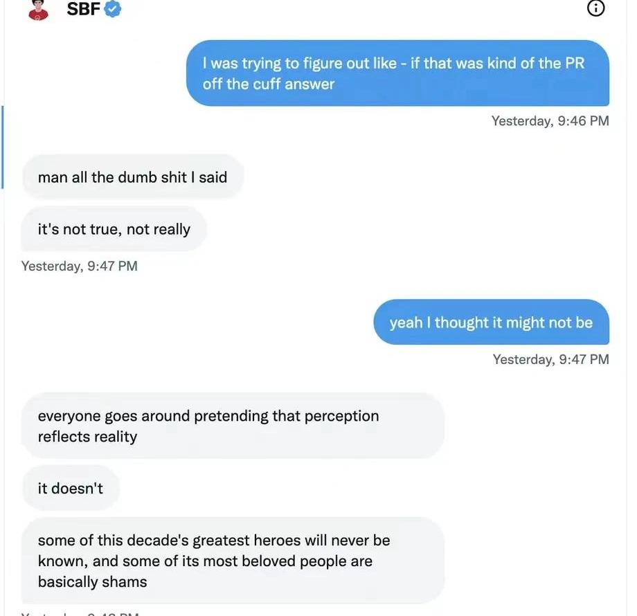 我曾在今年夏天早些時候通過Zoom與SBF進行過交談,當時我正在撰寫他的簡介。所以在11月13日,有消息稱他的加密貨幣交易所已經崩潰,數十億的客戶存款消失后,我通過推特私信聯系了他。我沒想到他會做出回應——通常,正在接受SEC和美國司法部調查的人不會做任何回復。聯系上SBF后,他顯然想談談。關于FTX和他的對沖基金AlamedaResearch如何拿客戶的錢賭博,他聲稱,他們沒有意識到自己在做什么。沒有意識到誰會被稱贊為英雄,誰會成為替罪羊。他還談到監管問題,談到他后悔的事情,以及他會如何對待FTX和Alameda。當時已經過了巴哈馬時間午夜,我們在推特私信里來回聊了一個多小時。SBF表示仍在努力籌集償還所有儲戶所需的資金。當我們交流的時候,我試圖弄明白,在公關、慈善捐款和游說的背后,SBF到底相信什么是對的,什么是錯的,尤其是他所從事的工作和他所在行業的道德準則。我們的整個談話中要面對這樣一個背景——那些信任他的人失去了積蓄,他已對一開始的承諾造成了無法估量的破壞。我們的談話結束后,我對他所說的許多話感到震驚。的私信對話。)關于監管