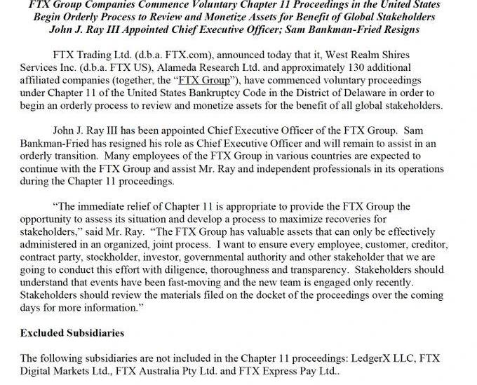 XRP/HKD-3.6%北京時間11月11日22:14,FTX官方發布公告稱,包括AlamedaResearch、FTXUS在內的134家相關實體已根據美國《破產法》第11章向特拉華州地方法院申請破產重組。