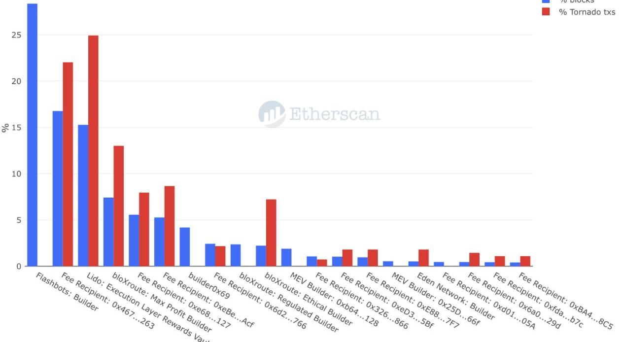 在合并之后出現的一些事情使人們對集中度變得更加擔憂。例如受美國制裁的影響,一些區塊構建者避免在Tornado進行交易,這意味著這些隱私保護的交易減少了30%到40%。這里存在的爭議是用戶是否需要避免使用OFAC制裁的地址或協議。盡管美國政府并沒有具體建議,所以遵守地方管轄是合理的,但這種情況的模糊性引起了一些爭議。Etherscan數據顯示的是最近按生成的區塊百分比和提議的Tornado路由器(0xd90e2f9)交易百分比對驗證者進行的細分。你可以在最左邊看到Flashbots,最大的區塊生成器,驗證0%Tornado交易。其他人也可能會使用Flashbot的中繼器。