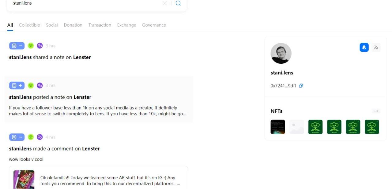 RSS3RSS3是一個比較好用的Web3搜索引擎。你在這個平臺搜索stani.lens,可以查到Stani的所有藏品,社交、捐贈、治理及交易記錄。并且信息都是以易讀的方式呈現。