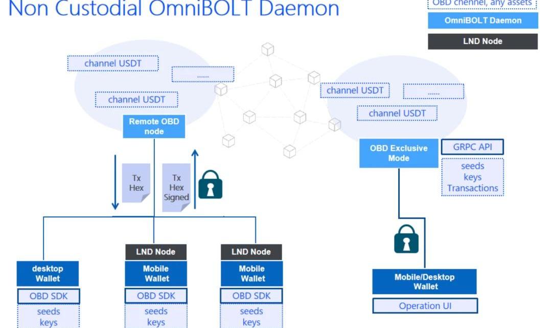 OBD實現了OmniBOLT規范,也是一個開源的鏈外分散平臺,構建在OmniLayer網絡之上,在智能資產閃電網絡通道上實現基本的多跳HTLC支付、多貨幣原子交換和更多的鏈外合約。此外,OBD是專為入境流動性提供商設計的。守護程序允許數千個遠程light客戶端連接,包括來自LND錢包的連接。OmniBOLT的工作原理