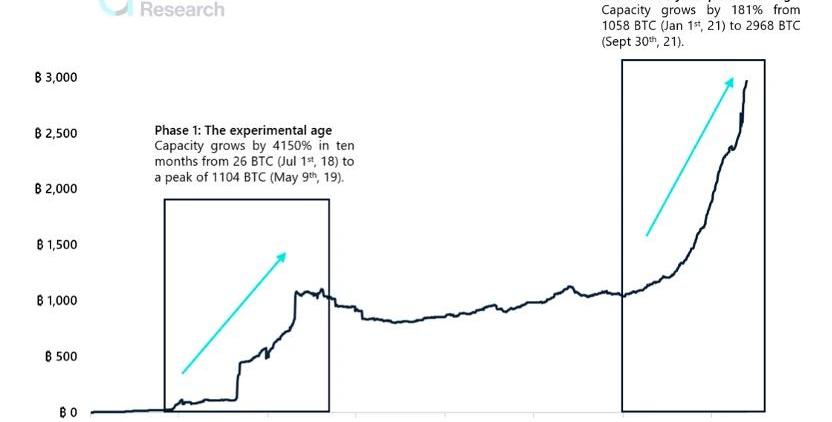 閃電網絡自2018年推出以來,一直僅有一些小眾應用。但最近的發展表明,這種情況正在迅速改變。自2020年底以來,閃電網絡的被使用量已經顯著增加,尤其是去年薩爾瓦多政府支持比特幣作為國家法定貨幣后。1、閃電網絡基礎數據穩步增長閃電網絡通道中BTC的數量:從2018年7月1日的26個,到2019年5月9日增長至1104個,一年增長了4倍;從2021年1月1日的1058個,到2021年9月30日增長至2968個,9個月增長近3倍。