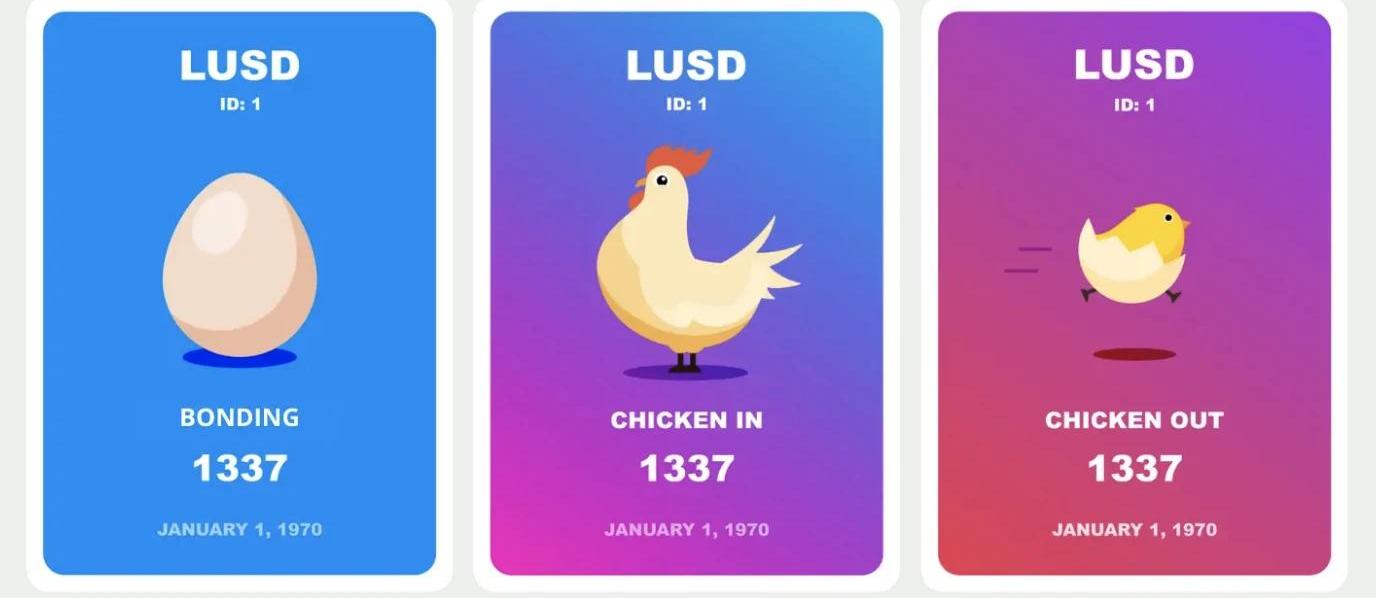 該協議的另一個特點就是會將債券以動態NFT的形式呈現出來,NFT的呈現結果是根據你的鏈上行為來決定的。當你綁定LUSD時,你會得到一個雞蛋NFT。ChickingIn之后,會得到一只雞NFT。ChickingOut之后會得到一個逃跑的雞NFT。