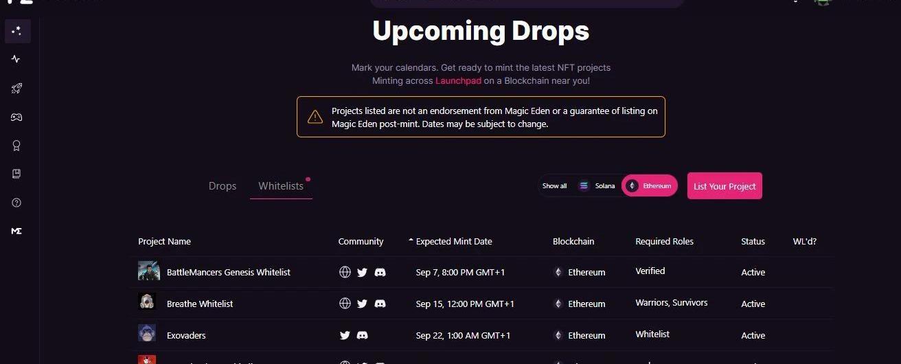Launchpad另一個只有在MagicEden上才能找到的獨特功能是白名單管理。MagicEden支持即將推出的精選列表,并為其白名單過程提供軟件管理。